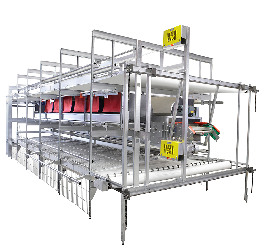 Systemet har også fodertrug på både den nederste og øverste etage. Vandrør med vandnipler på 2 niveauer (også foran reden) for at stimulere hønerne til bevægelse i systemet.